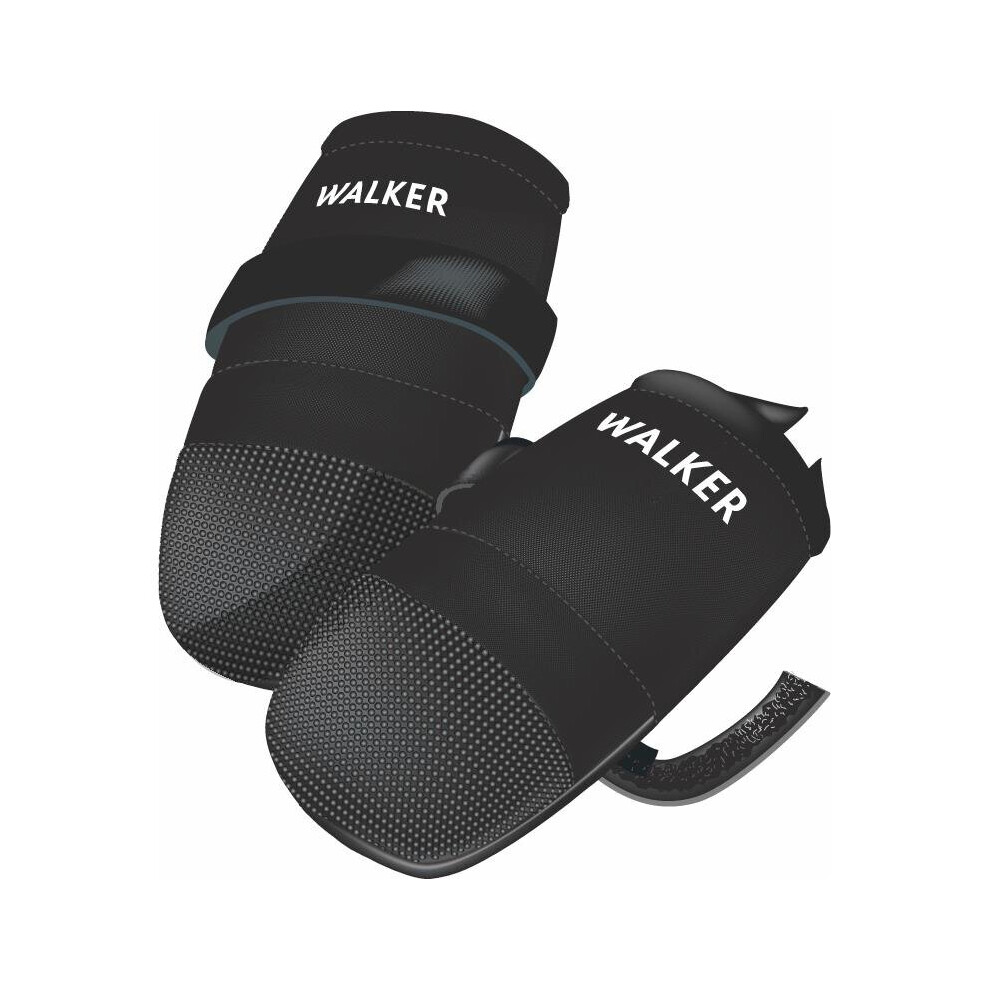 The Sports Protective Dog Boots were developed especially for dogs. These protective shoes reduce the risk of infection and help to keep paw wounds clean. They are great in the winter, and also if you and your dog are going for long walks on asphalt or stony paths. The dog boots are very comfortable. The outer shoe is made from pliant, breathable polyester with faux leather inserts which give the shoe a sporty look and help to keep your dog's paws dry. The TPR (thermoplastic rubber) soles have an anti-slip profile to give your dog more traction so that it does not slide around on slippery or stony ground. The boots are a great way to protect your dog's paws from the cold or heat, gravel, stone chippings or road salt. Each shoe has two Velcro tabs, ensuring a great fit whatever the breed and the reflective tabs will make your dog more visible during the darker months. The Sports Protective Dog Boots are water repellent and can be cleaned with a damp cloth. The Sports Protective Dog Boots at a glance: Colour: black Material: 100% polyester Anti-slip TPR (thermoplastic rubber) profile Expansion gusset makes the boots easy to put on and take off Very comfortable Double Velcro fastening Soft fleece lining Reflective trim for added visibility Breathable Water repellent Hand wash up to 30°C Note:To keep the boots water repellent impregnate with a waterproofing spray before using for the first time and after each wash. Choosing the right size for your dog: Use a tape measure to measure the width of your dog's paw at the widest point while your dog is standing. (A dog's foot spreads when it is standing and it is important to measure at the widest point when standing to give the best fit). If your dog's paw width falls between two sizes, choose the larger size. You also need to measure around the paw to ensure the boot opening is big enough for your dog's paws. Now measure the total length of the boot size you have selected against your dog's paw and leg, starting at the tip of the paw and going up the leg. Measure the paw circumference at the point on your dog's leg that corresponds to the top of the boot. If the boot opening is too large it can easily be tightened with included Velcro tabs. Size Boot width Boot length Boot opening circumference Boot height (paw height) Grip soleL x W Velcro tabs Width XS (2) 5 cm 11 cm up to 13.5 cm 3 cm 6 x 5 cm 1.4 cm S (3) 5.3 cm 11 cm up to 15.5 cm 3.5 cm 6 x 5.3 cm 1.4 cm M (4) 5.8 cm 12 cm up to 16 cm 3.5 cm 6.3 x 5.8 cm 1.4 cm L (5) 6.5 cm 12 cm up to 16.5 cm 3.8 cm 7 x 6.5 cm 1.4 cm XL (6) 7 cm 14 cm up to 19.5 cm 4 cm 7 x 7 cm 2 cm XXL (7) 8 cm 14.8 cm up to 21.5 cm 4.5 cm 8.5 x 8 cm 2 cm It is important that you measure your dog's paw while it is standing! Please note: A numerical size (from 2-7) is imprinted on the sole of these boots. e.g. For dog boots in size XXL, there is a numerical 7 imprinted.