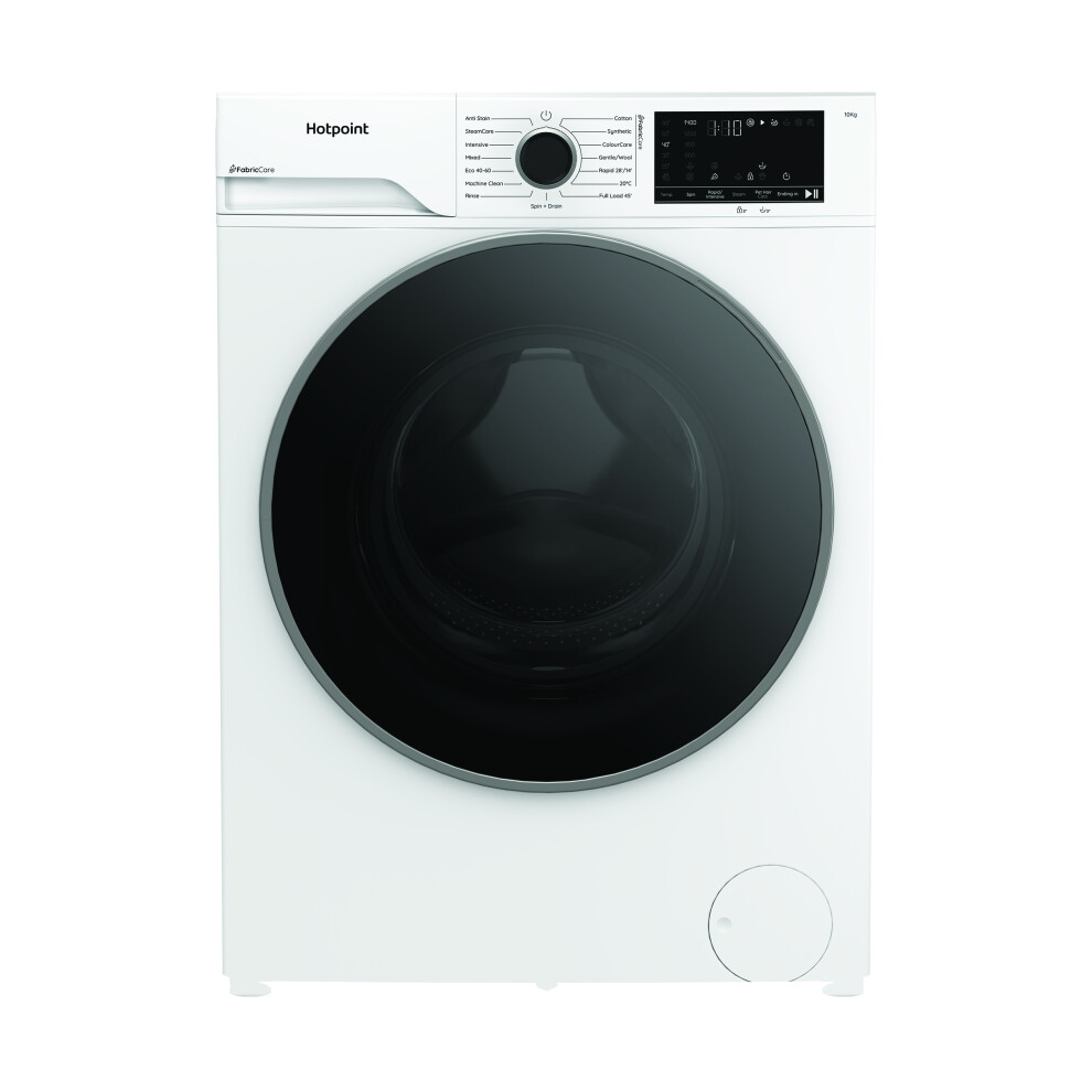 Capacity: 9 kg Spin speed: 1400 rpm Quick wash time: 28 minutes for 9 kg Energy rating: A Stain removal makes sure your clothes look their best Steam cycle refreshes your laundry HOTPOINT FabricCare HBCA 93 CARE UK 9 kg 1400 Spin Washing Machine - White